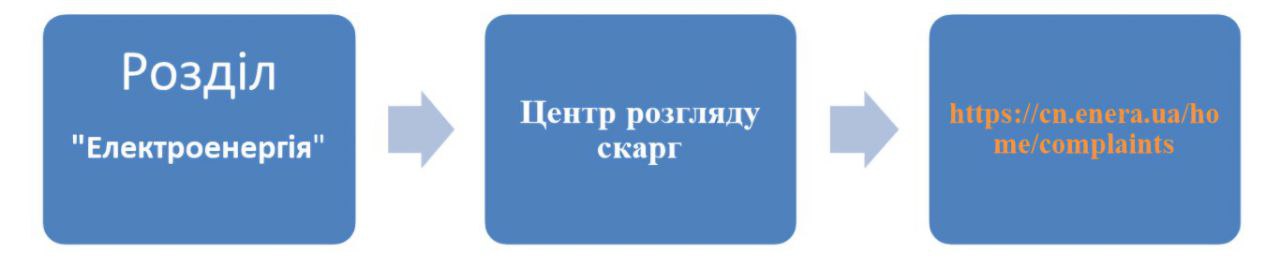 Для розгляду скарг заявником щодо порушення їхніх прав та законних інтересів, пов’язаних з електропостачанням у Товаристві реалізовано функції центру розгляду скарг (ЦРС). З процедурою розгляду скарги, звернень/претензій, порядком дій заявника у разі його незгоди з отриманою відповіддю за результатом розгляду скарги можна ознайомитись за посиланням: https://cn.enera.ua/home/complaints