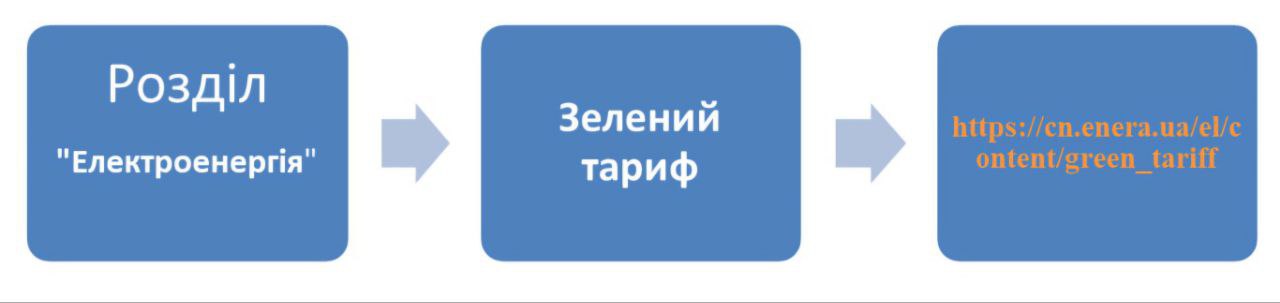 - «Зелений тариф»: загальна інформація, законодавчі акти, що регулюють взаємовідносини пов’язані з продажем та обліком електричної енергії, тарифи на згенеровану «зелену» електроенергію розміщена у розділі Електроенергія/«Зелений тариф» за посиланням https://cn.enera.ua/el/content/green_tariff
